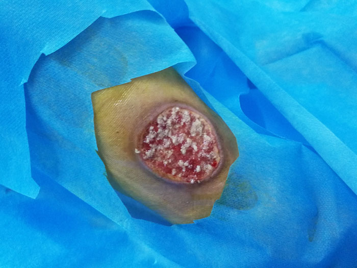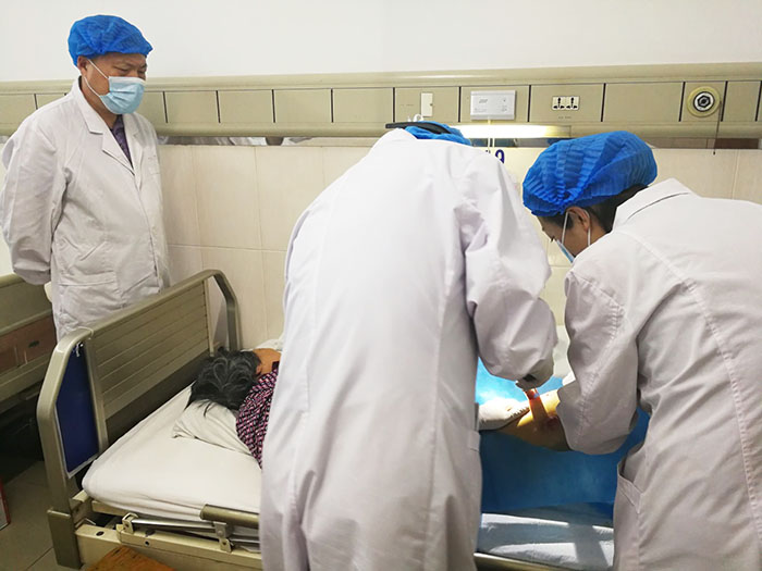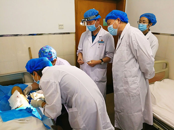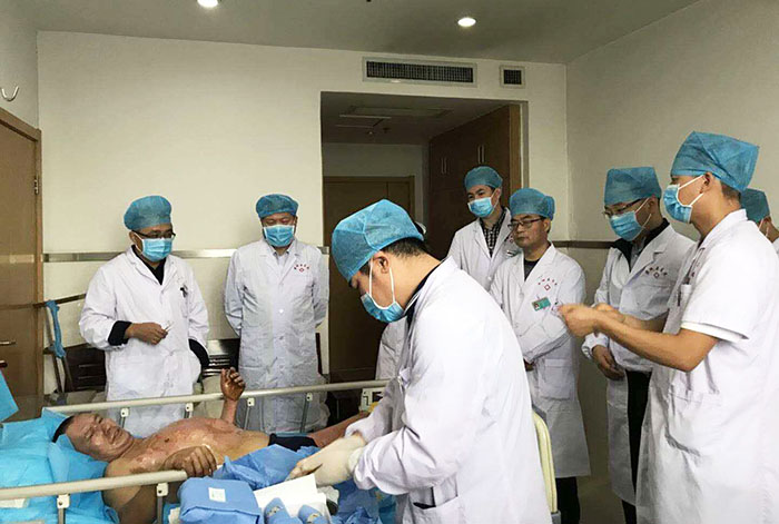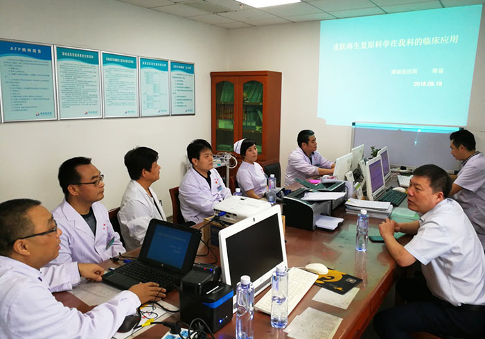 楊智斌總裁此行還會見了西安交通大學附屬西安第九醫(yī)院燒傷科肖厚安主任,該院作為陜西中西醫(yī)結(jié)合學會燒傷專業(yè)委員會主委單位,在再生醫(yī)療技術(shù)的臨床應(yīng)用中取得了一定成果,特別是在再生療法配合自體微粒皮種植技術(shù)治療面積較大的皮瓣、組織缺損創(chuàng)面的應(yīng)用方面,解決了傳統(tǒng)燒傷、創(chuàng)面治療缺少皮源這一難題。在肖厚安主任的陪同下,楊智斌總裁還現(xiàn)場觀摩了微粒皮種植術(shù)臨床應(yīng)用,認真聽取了該科室多年來應(yīng)用再生醫(yī)療技術(shù)治療的病例總結(jié)。