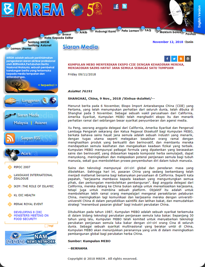 中央視電視臺(tái)新聞?lì)l道《朝聞天下》播出的進(jìn)博會(huì)專(zhuān)題新聞讓生活更精彩的眾多全球首發(fā)新產(chǎn)品介紹中,特別提到了美寶首發(fā)產(chǎn)品衡糖膠囊;北京電視臺(tái)《北京您早》欄目報(bào)道了美寶在進(jìn)博會(huì)的展位和產(chǎn)品,并指出再生醫(yī)學(xué)技術(shù)將服務(wù)更多市民;《中國(guó)婦女》雜志就進(jìn)博會(huì)對(duì)美寶集團(tuán)董事局副主席李俐進(jìn)行了特別報(bào)道;新華網(wǎng)專(zhuān)題云視頻“印象進(jìn)博會(huì)“也重點(diǎn)推介了美寶;《經(jīng)濟(jì)參考》捕捉到了美寶在中國(guó)植物藥的世界化發(fā)展中具有的獨(dú)特的價(jià)值,特別以“美國(guó)再生醫(yī)療保健品亮相首屆進(jìn)博會(huì) 中醫(yī)藥特色魅力成焦點(diǎn)”為題,大篇幅闡述了美寶集團(tuán)的背景及發(fā)展。