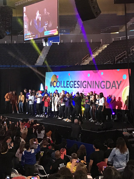 2019年5月1日上午,由前第一夫人米歇爾· 奧巴馬創(chuàng)立的大學(xué)定校日活動(CollegeSigningDay)在加州大學(xué)洛杉磯分校隆重舉行,來自全加州眾多高中的上萬名學(xué)生參加了這一盛會。一系列的慶祝表演節(jié)目不?;钴S現(xiàn)場氣氛,加州大學(xué)總校長Janet和洛杉磯分校校長Gene以及一些體育和演藝界明星出場鼓勵學(xué)生,米歇爾· 奧巴馬在會上壓軸出場,發(fā)表十幾分鐘的演講鼓勵中學(xué)生特別是那些低收入家庭的學(xué)生刻苦學(xué)習(xí),努力上大學(xué),創(chuàng)造光明未來。
