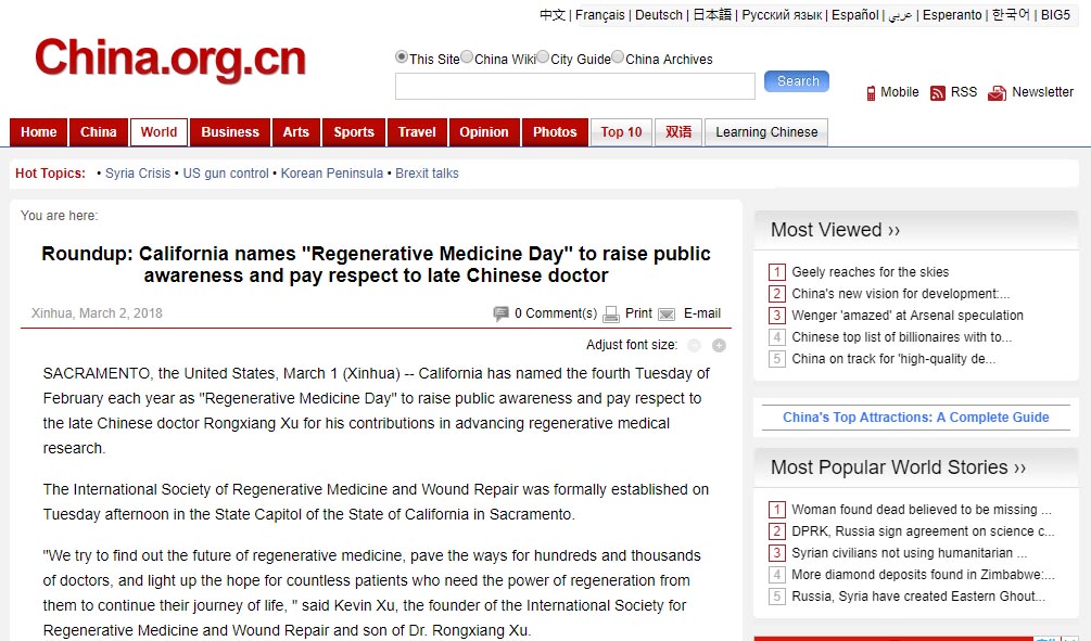 美國設(shè)立“再生醫(yī)學日”致敬已故的中國醫(yī)生