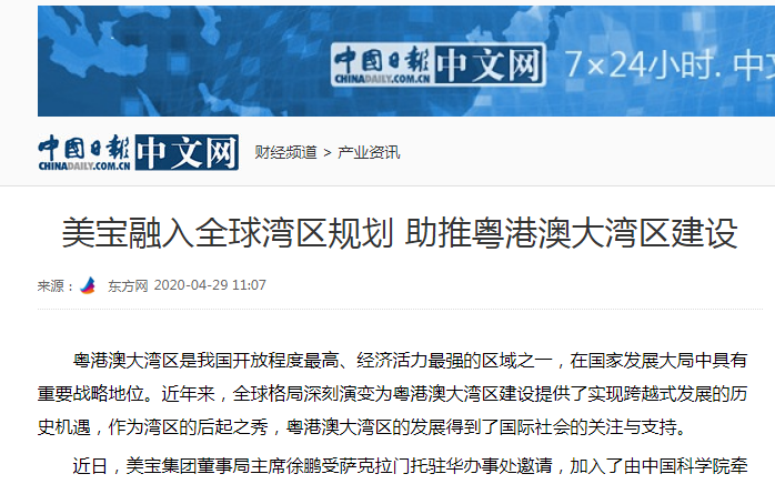 中國日報:美寶融入全球灣區(qū)規(guī)劃 助推粵港澳大灣區(qū)建設(shè)