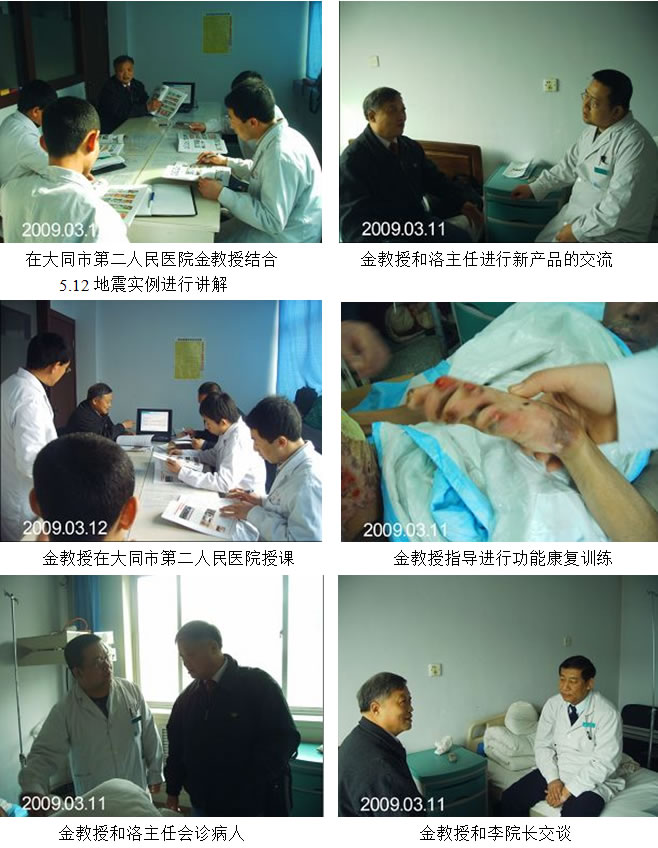 大同市地理位置十分重要,素有“北方鎖鑰”之稱(chēng),是我國(guó)中西部與東部連接線(xiàn),是內(nèi)蒙古通往山西的咽喉,也是北京和華北平原的側(cè)背。這種獨(dú)特的區(qū)位優(yōu)勢(shì),使大同成為中國(guó)中西部交匯處的一個(gè)具有多功能的區(qū)域性中心城市,2009年3月11日,金黨軍教授應(yīng)大同市第二人民醫(yī)院外科主任洛強(qiáng)的邀請(qǐng)來(lái)到了這里。地處大同市操場(chǎng)城街的大同市第二人民醫(yī)院是一家二甲醫(yī)院擁有床位400多張,醫(yī)護(hù)人員600余人,其中專(zhuān)業(yè)技術(shù)人員500多人,高級(jí)職稱(chēng)專(zhuān)家80多人,臨床科室45個(gè)重點(diǎn)學(xué)科,達(dá)明眼科中心、骨科、愛(ài)心婦產(chǎn)中心、普外科、血液凈化中心、口腔中心、腦外科、神經(jīng)內(nèi)科、消化內(nèi)鏡中心、泌尿外科、呼吸內(nèi)科、心血管內(nèi)科、內(nèi)分泌科、整形燒傷外科、肛腸外科、針灸理療科、藥氧中心等均為大同市領(lǐng)先學(xué)科。 金教授到來(lái)后,首先向洛主任和其他醫(yī)護(hù)人員詳細(xì)了解病人在入院期間用藥和治療的詳細(xì)情況,并對(duì)他們提出的問(wèn)題進(jìn)行了詳細(xì)的解答。其后對(duì)病人的治療方案同洛主任進(jìn)行了詳細(xì)的安排,金教授囑咐一定要嚴(yán)格按照皮膚器官原位再生復(fù)原技術(shù)的要領(lǐng)來(lái)為患者進(jìn)行治療。之后金教授與剛剛打完點(diǎn)滴的李院長(zhǎng)就皮膚器官原位再生復(fù)原技術(shù)的新產(chǎn)品速愈貼在臨床應(yīng)用知識(shí)進(jìn)行了探討,并就速愈貼在其它醫(yī)院已經(jīng)取得的實(shí)際臨床效果進(jìn)行了一系列展示,同時(shí)結(jié)合現(xiàn)在醫(yī)院的實(shí)際病例如何運(yùn)用皮膚器官原位再生復(fù)原技術(shù)后取得的效果進(jìn)行了長(zhǎng)時(shí)間的交流。一席長(zhǎng)談過(guò)后,李院長(zhǎng)對(duì)速愈貼產(chǎn)生了濃厚的興趣。