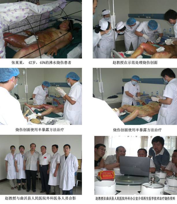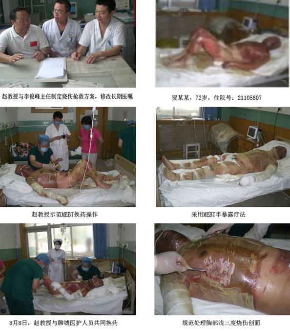 簡訊1:8月6日,應(yīng)山東聊城中醫(yī)院外科邀請,趙瑞慶教授第一時(shí)間趕到該院,指導(dǎo)使用MEBT技術(shù)搶救了一例燒傷面積72﹪TBSA的酒精燒傷病人,與該院外科醫(yī)務(wù)人員共同制定搶救方案,親自示范再生技術(shù)操作換藥,規(guī)范簡易燒傷病房管理。