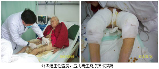 2012年3月2日~5日中國中西醫(yī)結(jié)合學(xué)會(huì)燒傷專業(yè)委員會(huì)常委,北京美寶燒傷創(chuàng)瘍研究所臨床部杜福勤主任受齊國軒主任的邀請(qǐng)?jiān)俅蝸淼酵畋笨傇簽?0歲高齡患者及高位截癱褥瘡患者會(huì)診。