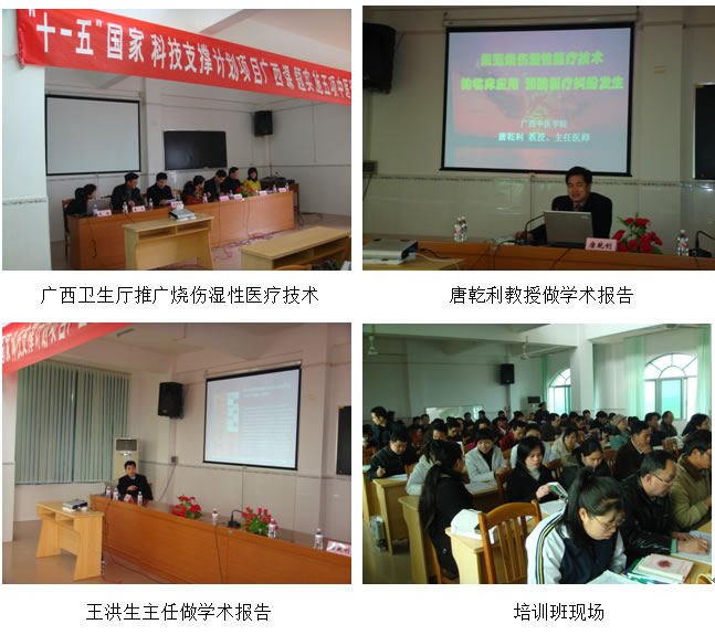 為在廣西壯族自治區(qū)構(gòu)建省、市、縣三級燒傷皮膚原位再生復(fù)原技術(shù)醫(yī)療救治網(wǎng)絡(luò),達(dá)到盡快在廣西全區(qū)普及并規(guī)范燒傷皮膚原位再生復(fù)原醫(yī)療技術(shù)之目的,受廣西中醫(yī)藥管理局委托,根據(jù)廣西自治區(qū)衛(wèi)生廳2009年2月25日下發(fā)的“關(guān)于協(xié)助開展農(nóng)村醫(yī)療衛(wèi)生適宜技術(shù)培訓(xùn)班”的函(桂衛(wèi)函〔2009〕號)中關(guān)于“為開展好我區(qū)農(nóng)村醫(yī)療衛(wèi)生適宜技術(shù),由廣西中醫(yī)藥管理局呂琳副局長和廣西中醫(yī)學(xué)院科技處處長唐乾利教授帶領(lǐng)的廣西中醫(yī)藥適宜技術(shù)推廣培訓(xùn)班專家組及工作人員一行20人等,由南寧前往金秀分批對該縣縣、鄉(xiāng)(鎮(zhèn))、村各級醫(yī)藥技術(shù)人員開展燒傷濕性醫(yī)療技術(shù)臨床規(guī)范化應(yīng)用等5項(xiàng)適宜技術(shù)的免費(fèi)推廣培訓(xùn)。第一期培訓(xùn)班于2009年3月7~9日在位于廣西金秀縣桐木鎮(zhèn)的金秀縣人民醫(yī)院桐木分院六樓會議室舉行。