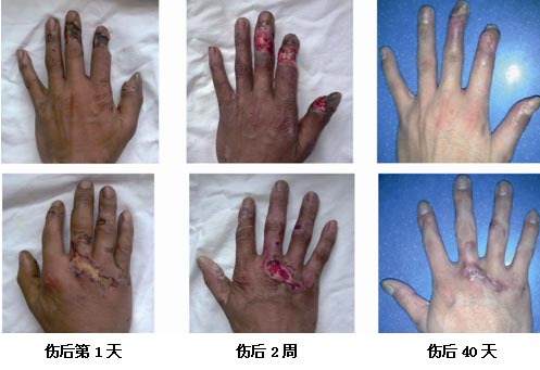 本組28例手部電擊傷創(chuàng)面全部治愈,愈合時間最短22天,最長65天,平均39天。創(chuàng)面愈合后無明顯瘢痕生長或淺表性瘢痕柔軟,無明顯關節(jié)功能障礙。(見下圖)