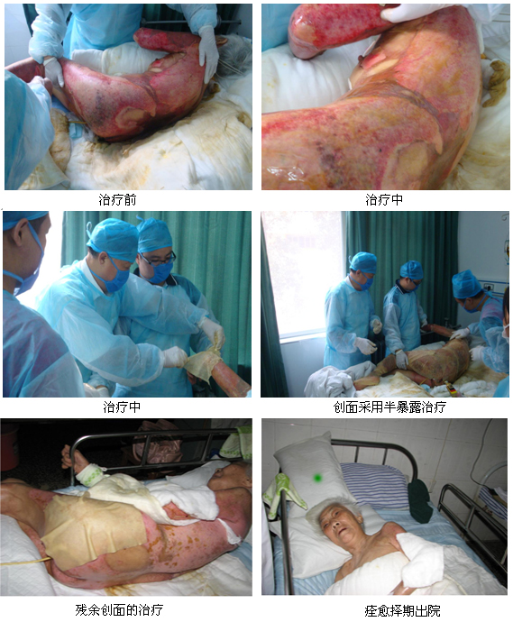 邵陽市人民醫(yī)院是今年剛掛牌成立的中心醫(yī)院,在燒傷科掛牌前該院于2010年8月6日收治了1例重度燒傷患者,院領(lǐng)導(dǎo)非常重視?;颊邉⒛?,女性,88歲。因腰部疼痛行蒸汽治療時不慎跌入開水中,導(dǎo)致背部、雙側(cè)側(cè)胸、左側(cè)乳房、臀部、會陰部,左側(cè)上、下肢及右側(cè)大腿后外側(cè)等燙傷,患者傷后1.5小時入院。入院診斷:特重度燒傷。燒傷面積60% TBSA,III度燒傷面積為15%TBSA;深I(lǐng)I度燒傷面積為45% TBSA?;颊呷朐汉?,醫(yī)院立即靜脈置管建立可靠靜脈通路,并將其轉(zhuǎn)入ICU病房后采用抗休克等綜合治療。中國燒傷創(chuàng)瘍科技中心臨床部金黨軍教授在接到該院的電話后,立即從湖北趕往邵陽為患者會診。