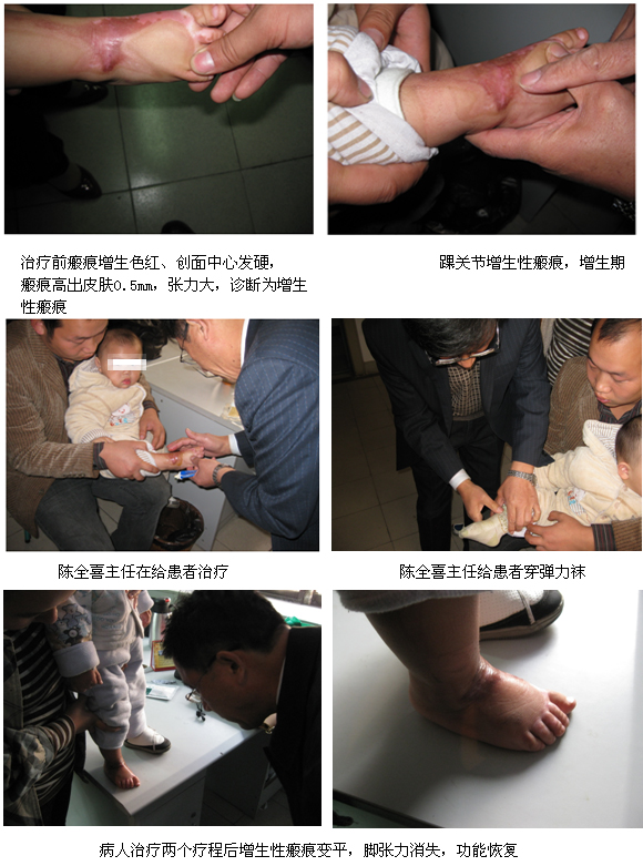 病例一:張某 ,男 ,1歲半,許昌人,右腳踝關節(jié)不慎被熱液燙傷,愈合后創(chuàng)面瘢痕增生、色紅,在外院用防瘢痕藥+彈力壓迫治療2個月,療效不顯著。該患于2010年10月7號到許昌市第二人民醫(yī)院燒傷科就診?;颊呷朐簳r一般情況:右踝關節(jié)處瘢痕色紅、中心皮硬,高出皮膚0.5mm,足放平時足趾上翹,用手強行平放后張力感重。小兒因張力疼痛哭鬧,初步診斷:增生、攣縮性瘢痕,采用美寶疤痕軟膏治療2個療程功能已恢復,增生處消退。如下圖。