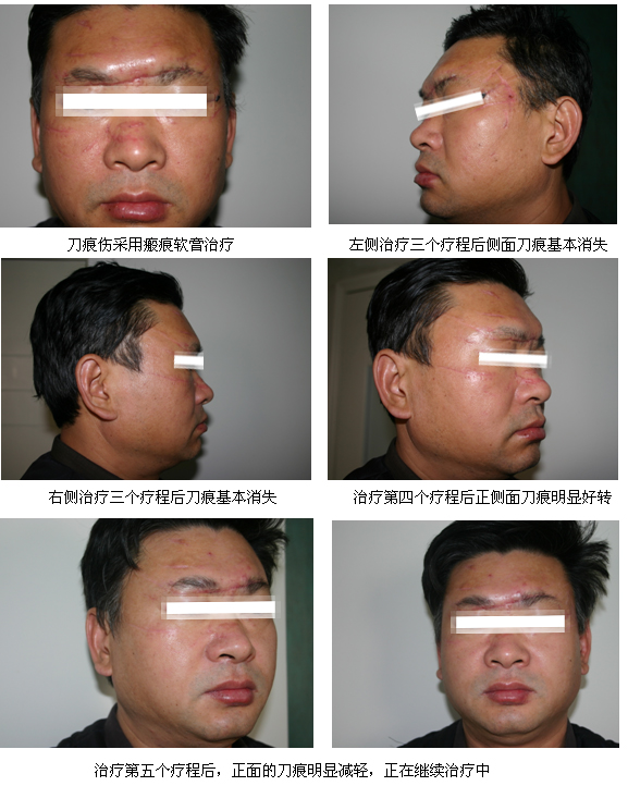 病例二:程某 ,男 ,27歲,農(nóng)民 。該患2010年2月誤被刀砍傷面部,傷口愈合后刀痕明顯,無法面對正常生活,逐產(chǎn)生輕生念頭。家人四處求醫(yī)為其治療,效果都不理想。2010年8月10日,該患接受河南大學附屬南石醫(yī)院采用原位再生醫(yī)療技術治療,治療效果滿意。如下圖。