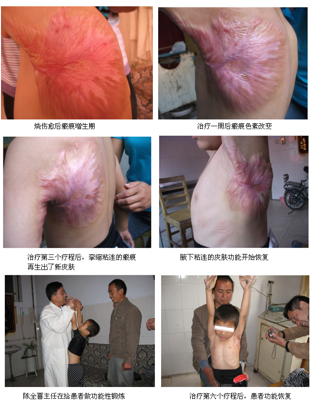 粘連、蹼狀瘢痕的治療是臨床上一個棘手問題,其方法繁多,臨床都是采用手術療法治療,通過保守治療傷后粘連性瘢痕的報道少之又少。隨著再生醫(yī)療技術的發(fā)展及美寶疤痕軟膏的臨床應用解決了深度燒傷愈后創(chuàng)面的疤痕預防、保健和治療的技術難題,以上醫(yī)院通過應用原位再生醫(yī)療技術和美寶疤痕軟膏治療攣縮性瘢痕、粘連性瘢痕、增生性瘢痕,在陳全喜主任精心的指導下,均取得了顯著的療效,只要堅持正確的療程和方法進行應用,一般都不需手術或大大縮小手術范圍,隨著病程轉歸大部分增生性疤痕都能自行消退,通過大量臨床實踐效果滿意,再次呼吁對深度燒傷愈后患者應用美疤痕軟膏作為疤痕的預防與治療,應列為常規(guī),以減少疤痕增生或致殘。