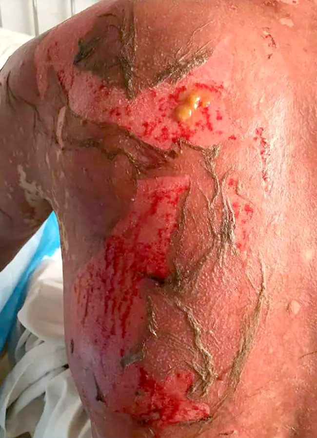 皰皮開始脫落,可見粉色的上皮爬行,患者主訴之前出現(xiàn)的瘙癢、疼痛等不適感幾乎消失,患者狀態(tài)較好。皮膚大部分顏色恢復(fù)至正常顏色,繼續(xù)應(yīng)用美寶濕潤燒傷膏。