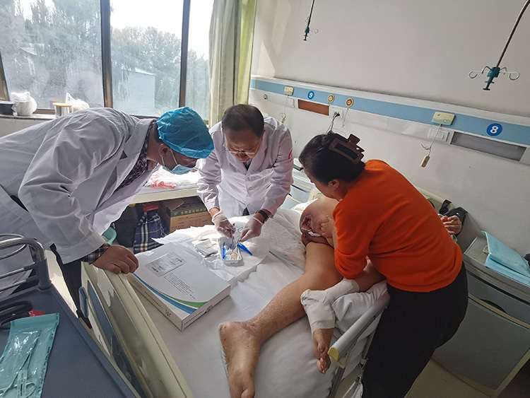10月12日,《中國燒傷創(chuàng)瘍雜志》編委、燒傷創(chuàng)瘍再生醫(yī)療技術(shù)臨床專家張強,到訪羅田縣人民醫(yī)院,親自為一位壓瘡患者進行了清創(chuàng)和換藥處理,并與臨床工作人員就慢性創(chuàng)瘍的治療方案和規(guī)范清創(chuàng)換藥的方法與經(jīng)驗進行了深入的探討!隨后還給患者家屬進行了關(guān)于患者營養(yǎng)配餐的指導與叮囑,受到了患者家屬及臨床工作人員的一致好評!