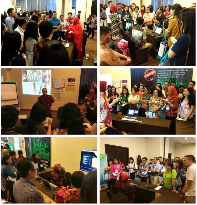會(huì)議中,來自雅加達(dá)的Dr. Vika Tania/Dr. Afriyanti Sandhi/Dr. Aditya Herwandar講解了燒傷創(chuàng)瘍?nèi)梭w復(fù)原的基本理論; Dr. Aditya Herwandar/Dr. Donna Savitry/Dr. Puri Ambar Lestari則就創(chuàng)瘍的再生醫(yī)學(xué)基本護(hù)理進(jìn)行了闡述;Dr. Donna Savitry/Dr. Laksmi Achyati/Dr. Afriyanti Sandhi則以再生醫(yī)學(xué)燒傷的基本護(hù)理為主題展開論述;而Dr. Vika Tania/Dr. Puri Ambar Lestari則通過燒傷病例的分享讓大家更好的了解這一技術(shù);Dr. Mendy H.Oley/Dr. Maximillian Ch.Oley則分享了治療過程中控制疼痛的方法。隨后在場(chǎng)200余位參會(huì)者分六組進(jìn)行了討論,以燒傷在不同場(chǎng)景和情況下的急救措施和后續(xù)護(hù)理為重點(diǎn)進(jìn)行了熱烈的交流。