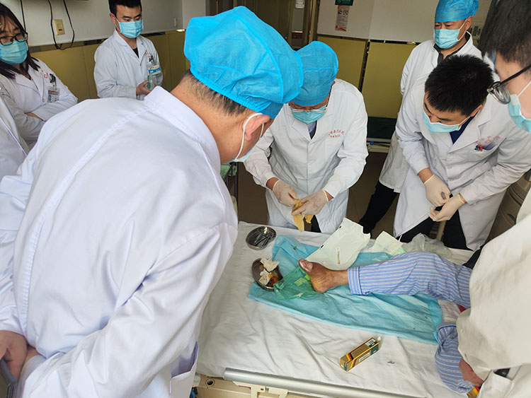 2023年3月13日,中國中西結(jié)合學會燒傷專業(yè)委員會醫(yī)療部張強教授應邀到湖北省荊州市江陵縣人民醫(yī)院會診多例慢創(chuàng)病人,張教授親自示范換藥操作,同時給醫(yī)生做細致的講解,并對后期治療提出合理方案,得到了李明醫(yī)生的高度認可。