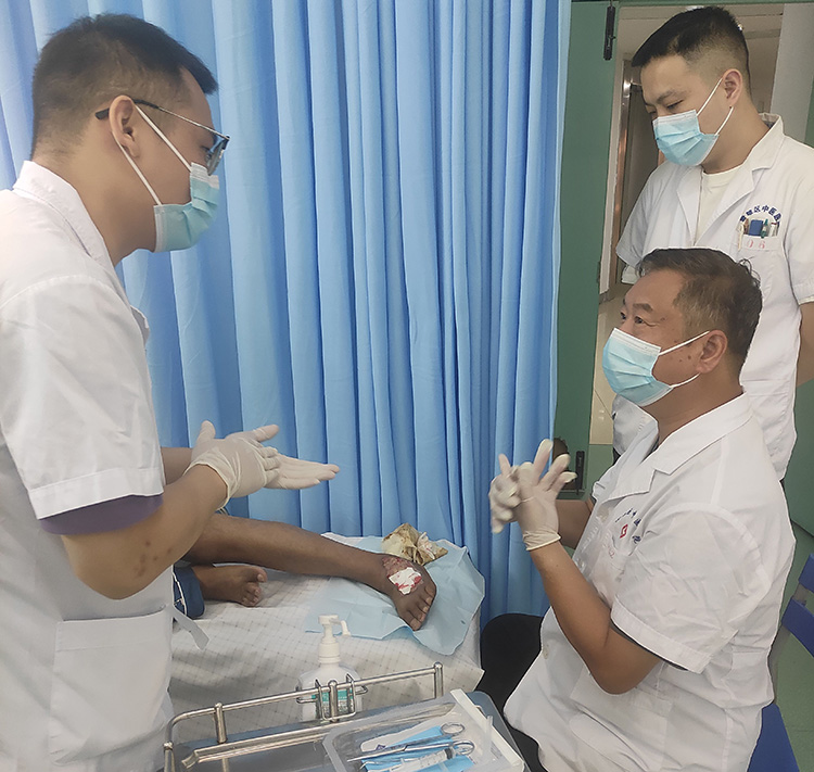2024年9月22日, 應(yīng)黃江區(qū)中醫(yī)院外科葉峰主任邀請(qǐng),《中國(guó)燒傷創(chuàng)瘍雜志》編委、燒傷創(chuàng)瘍?cè)偕t(yī)療技術(shù)臨床專(zhuān)家張強(qiáng)來(lái)到該院會(huì)診,對(duì)一例腳部筋骨外露的透析患者現(xiàn)場(chǎng)示范換藥,講解換藥細(xì)節(jié),后與科室醫(yī)生就臨床中遇到的慢性創(chuàng)面的處理做了交流,此次活動(dòng)極大增進(jìn)了大家對(duì)再生醫(yī)療技術(shù)的了解,增強(qiáng)了運(yùn)用技術(shù)治療慢性創(chuàng)面的信心!