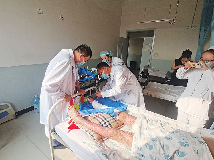 9月27日,應(yīng)大同市云岡區(qū)人民醫(yī)院邀請(qǐng),《中國(guó)燒傷創(chuàng)瘍雜志》常務(wù)編委、燒傷創(chuàng)瘍?cè)偕t(yī)療技術(shù)臨床專(zhuān)家趙瑞慶教授在該院進(jìn)行臨床教學(xué)查房,共檢視了7例慢瘡患者(糖尿病潰瘍3一5級(jí)5例,頸后巨大癰1例,燒傷多部位合并癥、骨外露、會(huì)陰部粘連、左肘關(guān)節(jié)粘連、右足多趾干性壞死1例),并在事后對(duì)每一位患者制定了進(jìn)一步治療方案。