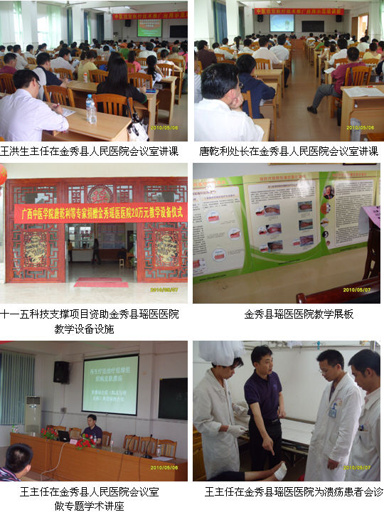 2010年5月6日~7日,由中國中西醫(yī)結(jié)合學會燒傷專業(yè)委員會副主任委員、廣西自治區(qū)中西醫(yī)結(jié)合學會燒傷分會主任委員、廣西中醫(yī)學院科研處唐乾利處長承擔的“十一五”國家科技支撐計劃項目中醫(yī)適宜技術推廣培訓班及系列臨床示范活動分別在廣西金秀縣瑤醫(yī)醫(yī)院、縣人民醫(yī)院及部分鄉(xiāng)鎮(zhèn)醫(yī)院進行。中國中西醫(yī)結(jié)合學會燒傷專業(yè)委員會常委、中國燒傷創(chuàng)瘍科技中心臨床部主任、北京燒傷創(chuàng)瘍研究所副所長王洪生教授應邀到廣西金秀縣桐木鎮(zhèn),為參加“十一五”國家科技支撐計劃項目農(nóng)村衛(wèi)生適宜技術應用示范研究燒傷濕性醫(yī)療技術在基層的規(guī)范化推廣運用培訓班的學員授課。5月6日下午2點30分,王洪生主任以“再生療法在深度燒傷及難治性創(chuàng)傷創(chuàng)面治療新進展”為題進行了專題講座,講座中王洪生主任結(jié)合大量的臨床病例圖片,主要針對不同深度的燒傷創(chuàng)面,及各類難愈性創(chuàng)傷、潰瘍創(chuàng)面的規(guī)范化處理方法與技巧,注意事項等進行了細致地講解,在場的金秀縣各級醫(yī)療單位的一百多名醫(yī)務人員為再生醫(yī)療技術的獨特療效所震撼。會后,金秀縣人民醫(yī)院的覃建宏院長、賀副院長、莫副院長,瑤醫(yī)醫(yī)院潘副院長、韋科長等醫(yī)院領導及專家對再生療法在多學科難愈性創(chuàng)面臨床療效產(chǎn)生了濃厚的興趣,紛紛向王教授請教在臨床上難治性創(chuàng)傷、潰瘍創(chuàng)面及手術切口瘢痕的預防的處理方法。5月7日上午,金秀瑤醫(yī)醫(yī)院還特邀王主任到該醫(yī)院為一名脈管炎合并右足潰瘍的患者進行會診。在本次學術活動期間,王主任還就金秀縣人民醫(yī)院及瑤醫(yī)醫(yī)院指派相關專業(yè)的醫(yī)護人員到中國中西醫(yī)結(jié)合學會燒傷專業(yè)委員會指定的相關培訓基地進行燒傷皮膚再生醫(yī)療技術培訓,并且上述兩家醫(yī)院的院領導有意向引進再生醫(yī)療技術,達到了推廣的目的。