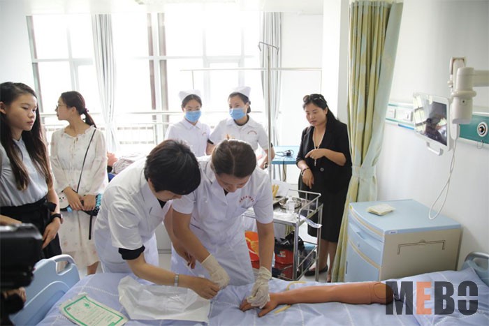 接著大家來(lái)到教室,與濱醫(yī)的學(xué)生一起學(xué)習(xí)了護(hù)理課程,中美老師代表分別進(jìn)行了授課。
