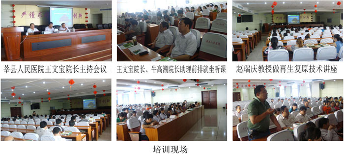 2012年7月3日,經(jīng)由魯西莘縣由衛(wèi)生局批準,莘縣人民醫(yī)院牽頭,成功地舉辦了一期再生復原技術培訓班。培訓對象主要來自莘縣人民醫(yī)院、莘縣中醫(yī)院、莘縣婦幼保健院外科、骨科、急診科、婦科的醫(yī)務骨干56人。會議由莘縣人民醫(yī)院王文寶院長主持。牛高潮院長助理在培訓前介紹了培訓班的籌備情況。