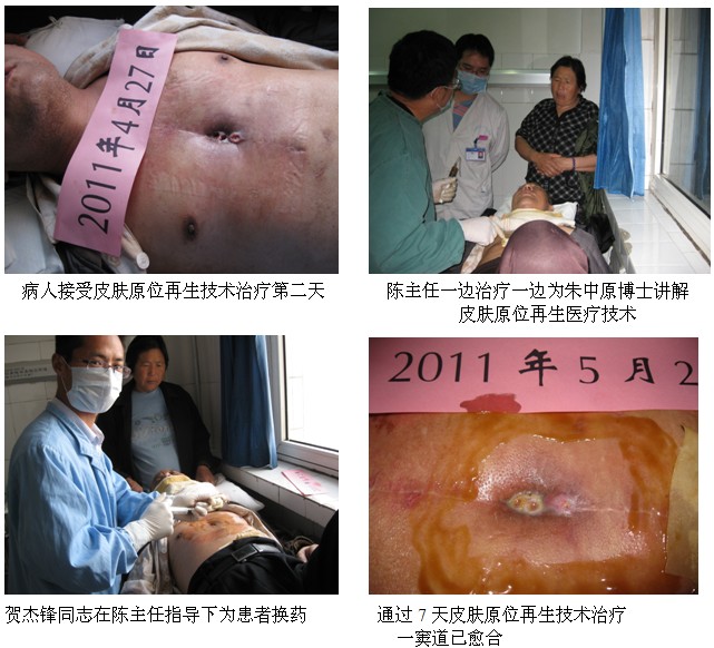 通過陳主任皮膚原位再生技術(shù)的闡述,在場的會診專家組成員均被原位再生醫(yī)療技術(shù)深深的折服,最后經(jīng)過集體會診研究決定,將該患交給陳全喜主任親自帶領(lǐng)該患的主治醫(yī)師、博士朱中原采用皮膚原位再生醫(yī)療技術(shù)為該患治療。換藥后第七天,患者傷口疼痛明顯減輕,體溫恢復正常,3個竇道中,其中一個竇道已接近愈合,患者正在進一步的治療康復中。