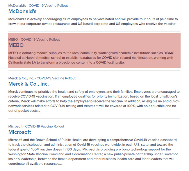 新冠肺炎疫情期間,MEBO不僅向當(dāng)?shù)厣鐓^(qū)捐贈(zèng)醫(yī)療用品,與哈佛大學(xué)醫(yī)學(xué)院等學(xué)術(shù)機(jī)構(gòu)合作建立新冠肺炎皮膚相關(guān)表現(xiàn)數(shù)據(jù)庫,還將加州州立大學(xué)洛杉磯分校(Cal state LA)徐榮祥生物科學(xué)創(chuàng)新中心設(shè)定為新冠肺炎免費(fèi)檢測中心。