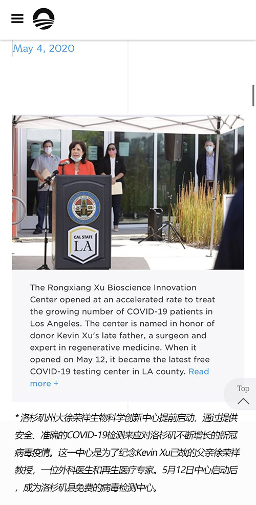 新冠肺炎疫情期間,洛杉磯州大徐榮祥生物科學(xué)創(chuàng)新中心設(shè)立為了新冠肺炎免費(fèi)檢測(cè)點(diǎn)。奧巴馬基金會(huì)將這一充滿溫情的信息與系列或感人或激勵(lì)的暖心小故事一起登于官網(wǎng),在艱難時(shí)刻傳遞希望與愛(ài)。