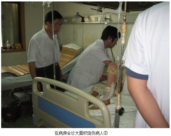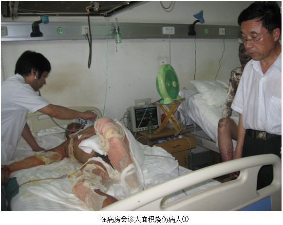 陳全喜主任到達油田醫(yī)院后,張主任介紹,該院來了一位大面積燒傷病人,燒傷面積87%,已經(jīng)2天了,并采用MEBT/MEBO進行治療,并邀請陳主任確定是否達到了MEBO技術的要求。陳主任立即趕往病房,病人平穩(wěn)地躺在病床上,全身用MEBO油沙半暴露療法。經(jīng)檢查,各項指標正常。會診后,陳主任較為滿意,陳主任與張主任確定將在科室晨起開會時,做講座。