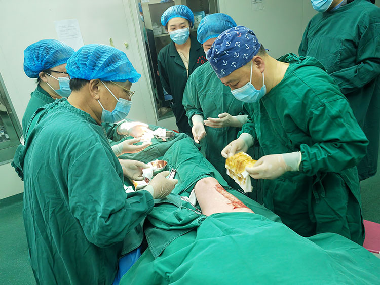 3月25日,應(yīng)上黨區(qū)中醫(yī)院第三次邀請,《中國燒傷創(chuàng)瘍雜志》常務(wù)編委、燒傷創(chuàng)瘍再生醫(yī)療技術(shù)臨床專家趙瑞慶,為一例車禍患者行保足收官修復(fù)手術(shù)。該患者第一階段2月份因車禍導(dǎo)致右踝關(guān)節(jié)、足底、跟骨壞死在地區(qū)醫(yī)院治療無效,轉(zhuǎn)回區(qū)醫(yī)院準(zhǔn)備截肢。第二階段接受再生醫(yī)療技術(shù)治療,逐漸恢復(fù)大部分軟組織生機(jī),保護(hù)骨組織成活。第三階段達(dá)到修復(fù)手術(shù)條件,實(shí)施修復(fù)手術(shù)。此病例保足成功得益于徐榮祥教授發(fā)明的再生醫(yī)療技術(shù),受到當(dāng)?shù)蒯t(yī)護(hù)和家屬的盛情稱贊。