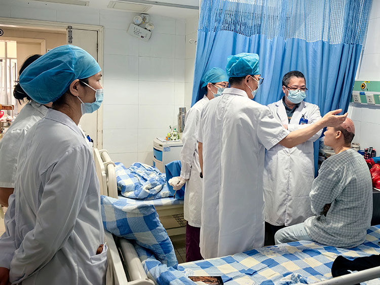 2025年3月27日,湖北宜昌長陽土家族自治縣人民醫(yī)院燒傷外科團(tuán)隊(duì)與中國紅基會徐榮祥再生生命公益基金志愿者共同慰問一名困難住院患者。田師傅因背部壞死性筋膜炎,治療周期長,家庭無經(jīng)濟(jì)來源負(fù)擔(dān)重,科室即刻為患者申請了中國人口文化促進(jìn)會燒傷創(chuàng)瘍患者關(guān)愛委員會《慢創(chuàng)患者千人幫扶行動(dòng)》,解決眼前燃眉之急。劉勇主任,黃小宇護(hù)士長,管床張磊醫(yī)師和康婕醫(yī)師等為患者進(jìn)行了創(chuàng)面換藥,并為他們送了牛奶面包等營養(yǎng)品。家屬備受感動(dòng),深表感激!