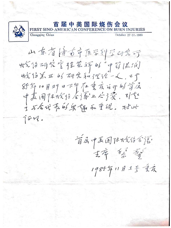 3、1985年10月,發(fā)明人出席重慶首屆中美國(guó)際燒傷會(huì)議,發(fā)表了濕潤(rùn)燒傷膏的研究論文,盛志勇主持會(huì)議,引起與會(huì)者重視,大會(huì)主席黎鰲教授寫出證明信函,望山東省支持徐榮祥的燒傷研究,隨之濟(jì)南市衛(wèi)生局誹謗是假信。(原件一直保留,只給他們看,沒交給他們,以下是原件)從此矛盾激化。衛(wèi)生局黨委發(fā)出最后通知,1986年8月31日,在局黨委書記辦公室寫了辭職報(bào)告(1986年9月1日,國(guó)家發(fā)布科技人員可辭職的文件生效日)。