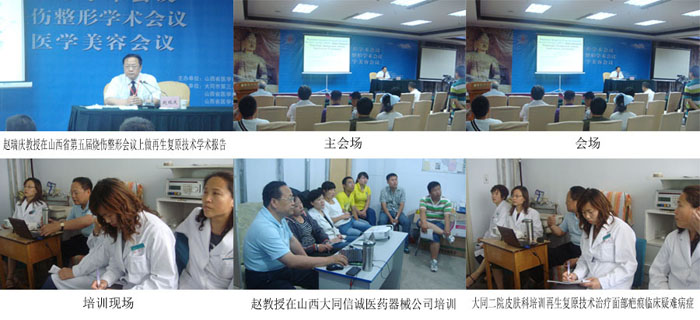 北京燒傷創(chuàng)瘍研究所副所長趙瑞慶教授于5月27日在山西省燒傷整形學術會議做再生復原技術講座,受到中外專家學者的一致好評。28日至30日分別在大同信誠醫(yī)藥器械公司、大同市二院皮膚科進行再生復原技術培訓。