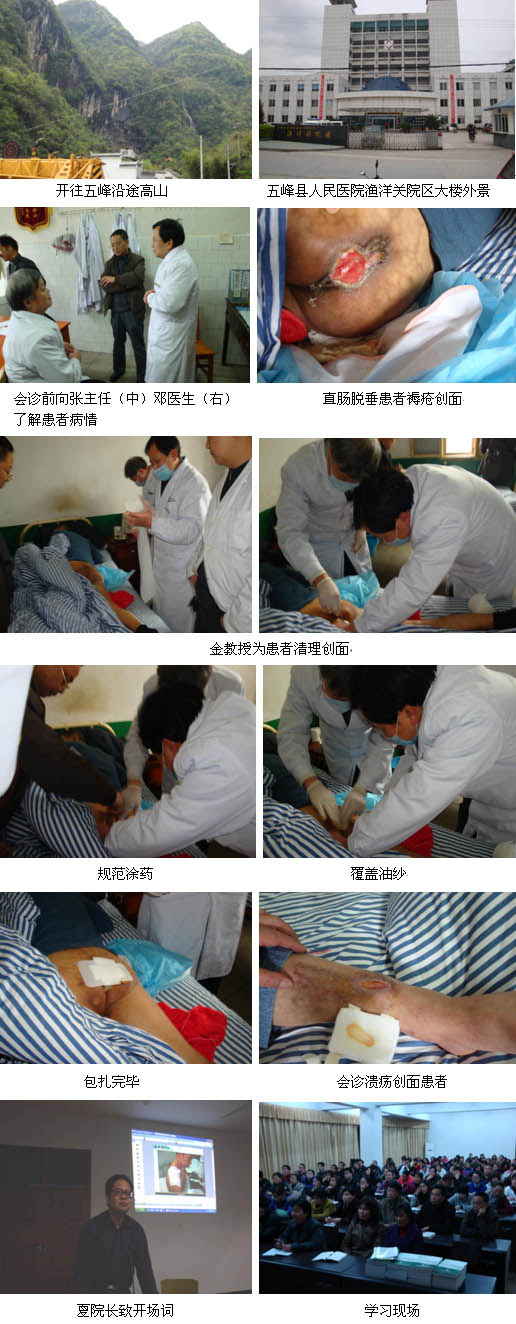 五峰土家族自治縣位于鄂西南邊陲,距宜昌市200公里,無高等級(jí)公路,山大人稀。一路蜿蜒顛簸,金黨軍教授歷經(jīng)了三個(gè)半小時(shí)車程到達(dá)漁洋關(guān)鎮(zhèn)。得知金教授來院授課,醫(yī)院夏院長、醫(yī)務(wù)科李科長和外科張主任熱情地接待了金教授,雙方就醫(yī)院目前發(fā)展的情況及再生醫(yī)學(xué)近期所取得的成就做了簡單地交流。該院外科為骨科、普外科等,該科于今年二月初引進(jìn)新一代功能復(fù)合輔料創(chuàng)瘍貼,取得了不錯(cuò)的臨床療效。2002年8月五峰縣漁洋關(guān)鎮(zhèn)唐黃坪煤礦發(fā)生重大瓦斯爆炸事故,八人遇難,第九人是由該院張主任應(yīng)用的濕性醫(yī)療技術(shù)和美寶濕潤燒傷膏將患者治愈,因此,再生醫(yī)療技術(shù)的神奇療效該院領(lǐng)導(dǎo)并不陌生??紤]到醫(yī)護(hù)人員的工作時(shí)間,夏院長和李科長將學(xué)術(shù)講座的時(shí)間定在晚上七點(diǎn)到九點(diǎn)。下午四點(diǎn),張主任陪同金教授到該院的住院病區(qū)進(jìn)行患者會(huì)診,其中一位為直腸脫垂、骶尾處褥瘡的老年患者,另一位患者為下肢潰瘍創(chuàng)面,創(chuàng)面較深。金教授分別為兩位患者清理創(chuàng)面后,進(jìn)行換藥,并制作油紗敷貼包扎,為醫(yī)務(wù)人員進(jìn)行換藥示范。