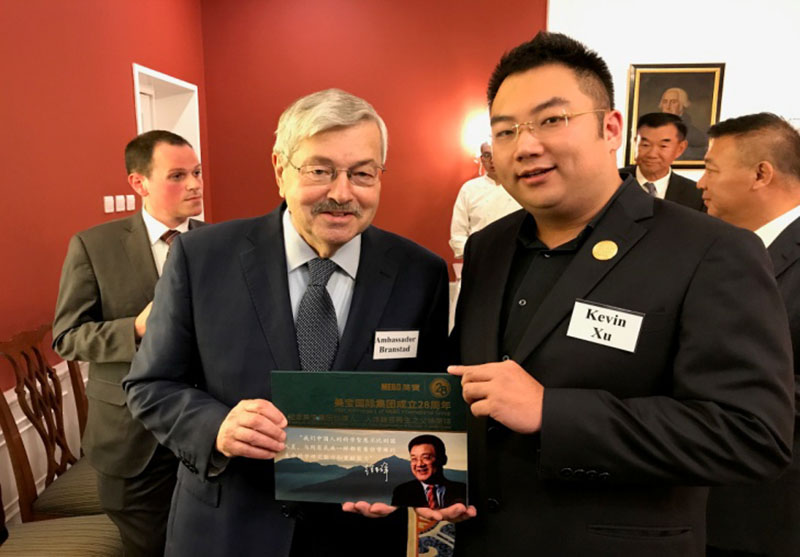 2017年9月14,美國(guó)駐華大使布蘭斯塔德及其夫人在北京的大使官邸舉行晚宴招待重要的美國(guó)駐華使領(lǐng)館官員以及政商領(lǐng)袖,答謝大家對(duì)促進(jìn)中美經(jīng)濟(jì)發(fā)展和友好關(guān)系做出的巨大貢獻(xiàn)并期待在其任期內(nèi)使中美的發(fā)展更進(jìn)一步。美寶集團(tuán)董事局主席徐鵬應(yīng)邀出席晚宴并贈(zèng)送徐榮祥紀(jì)念郵票冊(cè)給布蘭斯塔德大使。