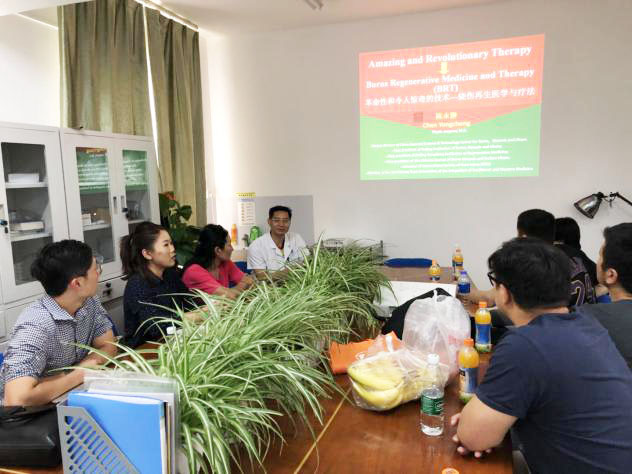 9月11日上午,蒙古來訪專家一行來到燒傷創(chuàng)瘍科病房區(qū)參觀交流,參觀了再生醫(yī)學療法治療糖尿病足、褥瘡、癌性創(chuàng)面及兩例85%以上的大面積燒傷患者在內(nèi)共三十多位患者的治療情況。隨后去門診了解門診患者的病情及就診情況。下午,陳永翀教授在會議室以課件形式給來訪專家們講解了再生醫(yī)學療法的操作規(guī)范及多病種病例,雙方就技術(shù)應用進行了深入的交流。