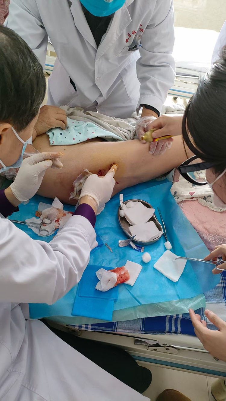 2023年2月15曰,巫溪縣渝溪醫(yī)趙勇教授受奉節(jié)縣普惠醫(yī)院王華麗院長(zhǎng)的邀請(qǐng),來(lái)到醫(yī)院對(duì)2名嚴(yán)重?zé)齻∪诉M(jìn)行診治并開(kāi)展學(xué)術(shù)交流活動(dòng),首先對(duì)一名深度燒傷的病人進(jìn)行了清創(chuàng)治療,對(duì)另一名大面積深度燒傷的病人進(jìn)行了再生醫(yī)療技術(shù)規(guī)范化換藥處理,最后在科室開(kāi)展了再生醫(yī)療技術(shù)規(guī)范化應(yīng)用交流。