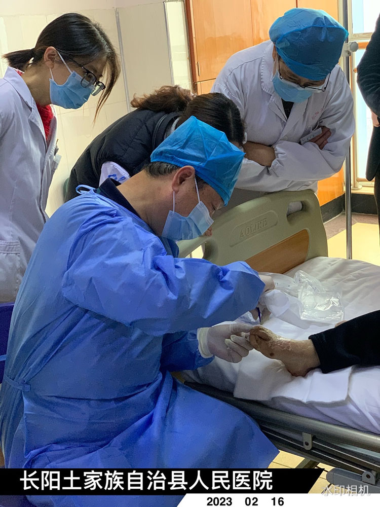 2023年2月16日,中國(guó)中西醫(yī)結(jié)合學(xué)會(huì)燒傷專(zhuān)業(yè)委員會(huì)醫(yī)療部張強(qiáng)主任和湖北省中醫(yī)師協(xié)會(huì)燒傷與創(chuàng)面修復(fù)專(zhuān)業(yè)委員會(huì)黃彥勇主任,共同走訪湖北宜昌長(zhǎng)陽(yáng)土家族自治縣人民醫(yī)院心胸甲乳燒傷科及內(nèi)分泌科,會(huì)診兩例燒傷患者和一例糖尿病潰瘍患者。其中腰部硫酸燒傷患者應(yīng)用再生醫(yī)療技術(shù)治療效果良好,張主任建議患者用腹帶固定,避免活動(dòng)脫落。另一例燒傷患者因在家處理不當(dāng)導(dǎo)致創(chuàng)面形成黑痂,張主任就剝痂術(shù)后換藥方法和注意事項(xiàng)向張磊醫(yī)師提供了中肯方案。糖尿病潰瘍患者張主任示范了竇道換藥小技巧和再生醫(yī)療技術(shù)規(guī)范換藥。此次交流醫(yī)師們又學(xué)習(xí)到很多臨床經(jīng)驗(yàn),紛紛向張主任表示誠(chéng)摯感謝!會(huì)診結(jié)束,張強(qiáng)主任、黃彥勇主任同燒傷科劉勇主任深入探討燒傷慢創(chuàng)學(xué)科建設(shè)與發(fā)展趨勢(shì),劉主任希望在學(xué)會(huì)的關(guān)注指導(dǎo)扶持下,規(guī)范發(fā)展,實(shí)實(shí)在在造?;鶎永习傩眨?/div>