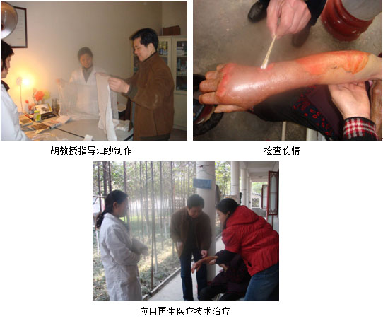 2009年2月27日,成都市敬老院一位老人不慎被燙傷,經(jīng)醫(yī)生診斷為:深Ⅱ度燒傷,15%TBSA。因敬老院醫(yī)務(wù)人員缺乏燒燙傷的救治經(jīng)驗(yàn),他們就向臨近的四川省中西醫(yī)結(jié)合學(xué)會(huì)咨詢救治方案。省學(xué)會(huì)李成林秘書長了解情況后,立即致電中國中西醫(yī)結(jié)合學(xué)會(huì)燒傷專業(yè)委員會(huì)胡教授,請(qǐng)其協(xié)助救治。胡教授聞?dòng)嵙⒓春蜔齻麑I(yè)委員會(huì)四川辦事處工作人員帶上再生醫(yī)療藥品在秘書長的陪同下及時(shí)趕到了成都市敬老院,現(xiàn)場(chǎng)指導(dǎo)敬老院的醫(yī)務(wù)人員運(yùn)用再生醫(yī)療技術(shù)和藥品對(duì)燙傷的老人進(jìn)行救治,并在敬老院醫(yī)務(wù)室對(duì)醫(yī)護(hù)工作人員進(jìn)行了再生醫(yī)療技術(shù)的講解和要點(diǎn)技術(shù)的再次示范,同時(shí)告訴醫(yī)務(wù)人員再生醫(yī)療技術(shù)還能廣泛的應(yīng)用于褥瘡、皮膚潰瘍等創(chuàng)瘍性疾病,如治療過程中還需要其它技術(shù)支持可隨時(shí)聯(lián)系。敬老院的醫(yī)護(hù)人員十分感謝胡教授將這項(xiàng)先進(jìn)的再生醫(yī)療技術(shù)教給他們,并表示要用這項(xiàng)技術(shù)為更多的老年人解除疾痛!
