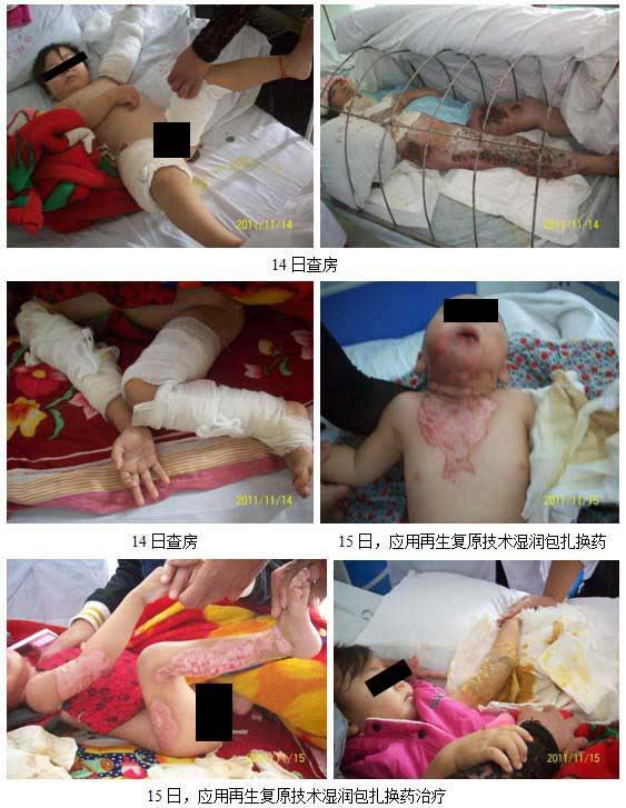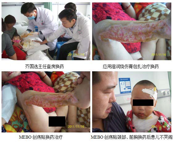 14日~17日,杜福勤主任再次來(lái)到燒傷科,在齊國(guó)選主任的帶領(lǐng)下看望了住院的燒傷和整形患者,并給予再生技術(shù)處理?yè)Q藥。15日給予示范換藥治療,得到患者及家屬的認(rèn)可和歡迎,特別是幼兒患者,應(yīng)用再生技術(shù)換藥后,患兒立即停止哭鬧;16日,應(yīng)用MEBO創(chuàng)瘍貼給頸胸部燙傷患兒和上下肢燒傷植過(guò)自體皮的患兒換藥治療,收到了良好的臨床效果。
