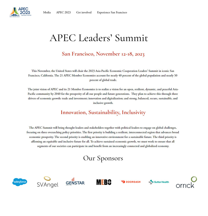 2023年11月12日至18日,亞太經(jīng)合組織峰會將把思想領(lǐng)袖和利益相關(guān)者與政治領(lǐng)導(dǎo)人聚集在一起,圍繞三個首要政策重點應(yīng)對全球挑戰(zhàn)。第一要務(wù)是建設(shè)一個有彈性、相互關(guān)聯(lián)的地區(qū),促進廣泛的經(jīng)濟繁榮。第二是為可持續(xù)的未來創(chuàng)造一個創(chuàng)新環(huán)境。第三個則是致力于形成公平和包容的未來。