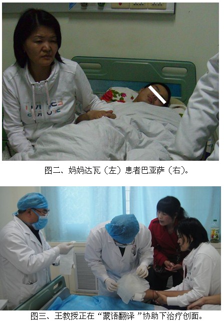由于親戚臨時有事沒來,母子二人為了保住巴亞薩凍傷的腳,從蒙古國不遠(yuǎn)千里來看病。大家只知道躺在病床上的小伙子名叫巴亞薩,20歲,右腳部被嚴(yán)重凍傷14天,腳趾頭變黑。初時只見蒙古國小伙的右腳纏著厚厚的紗布繃帶,旁邊的紙上寫著他的名字(BAYASAA)。當(dāng)王教授問他問題時,他只能用迷惑和搖頭來回答。由于語言不通,巴亞薩喊疼時大家都聽不懂。他們出去買點食物都得給親戚打電話問清楚才能出去買。在“診療計劃”也無法告知患者的難題下,王教授和醫(yī)生求助了電視臺、報紙等媒體向社會征集蒙古語翻譯的志愿者,好解決和患者的交流問題。