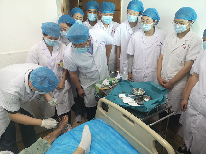 第二天大家繼續(xù)前往達(dá)郫都區(qū)人民醫(yī)院進(jìn)行了交流與學(xué)習(xí),享受國務(wù)院特殊津貼專家、成都市郫都區(qū)人民醫(yī)院燒傷創(chuàng)瘍科學(xué)術(shù)帶頭人付子俊教授帶領(lǐng)大家查房并對(duì)病人案例一一分析講解;科室主任也特別給濱醫(yī)學(xué)子講述了大面積燒傷和深度潰瘍的治療等。