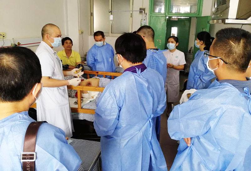 醫(yī)療專家們一行首先前往燒傷與創(chuàng)面修復科病房觀摩再生醫(yī)療技術(shù)在燒傷、糖尿病足潰瘍、壓瘡等創(chuàng)面的規(guī)范化治療。病房觀摩后,各醫(yī)療專家到會議室就再生醫(yī)療技術(shù)在慢性及難愈性創(chuàng)面的規(guī)范化應用進行了具體的學術(shù)交流及探討。就再生醫(yī)療技術(shù)在糖尿病足潰瘍、壓瘡創(chuàng)面、糖尿病足潰瘍及皮膚病的良好應用效果進行了交流,還特別分享了再生醫(yī)療技術(shù)在眼鏡蛇咬傷創(chuàng)面的臨床處理等。