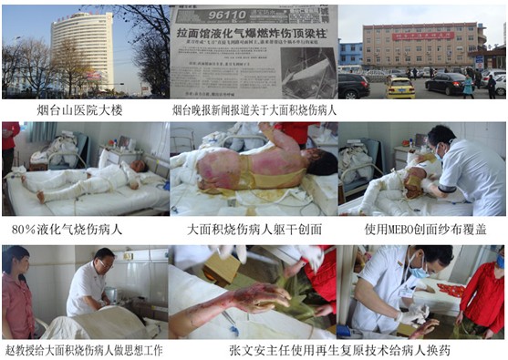 煙臺山醫(yī)院燒傷整形科曾在2011年10月份在張文安主任的帶領(lǐng)下使用再生復(fù)原技術(shù)治療一例85%大面積燒傷病人獲得成功。此例80%液化氣燒傷病人剛送到醫(yī)院,血壓下降,張文安主任沉著應(yīng)戰(zhàn)雙通道液體輸入抗休克搶救,并早期進(jìn)行簡易清創(chuàng)后創(chuàng)面用MEBO覆蓋(因病人信仰伊斯蘭教)。在第一時間北京燒傷創(chuàng)瘍研究所趙瑞慶教授也趕到搶救現(xiàn)場指導(dǎo)進(jìn)一步治療。