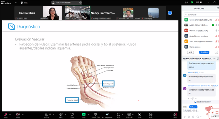 2025年5月9日(秘魯時間5月8日晚),該系列第三期——糖尿病足專題研討會順利開展。美寶國際技術(shù)部主任徐巍巍作為本次研討會的講者,系統(tǒng)性地從糖尿病足的病理生理學(xué)基礎(chǔ)、臨床診斷標(biāo)準(zhǔn)、治療方案優(yōu)化、再生醫(yī)療技術(shù)作用機制與臨床案例解析等多個維度,分享了糖尿病足不同階段的診療方法,全面展現(xiàn)了再生醫(yī)療技術(shù)的臨床價值與獨特優(yōu)勢。參會的醫(yī)生和學(xué)者多達(dá)100余人,來自秘魯、智利、巴拿馬、厄瓜多爾等拉美國家。在問答環(huán)節(jié)中,根據(jù)與會者提出的諸多問題,如再生醫(yī)療技術(shù)展現(xiàn)顯著療效的最短時間周期、各類治療方法聯(lián)合應(yīng)用、患者換藥頻次等問題,雙方進行了熱烈的討論,獲得與會者一致好評。