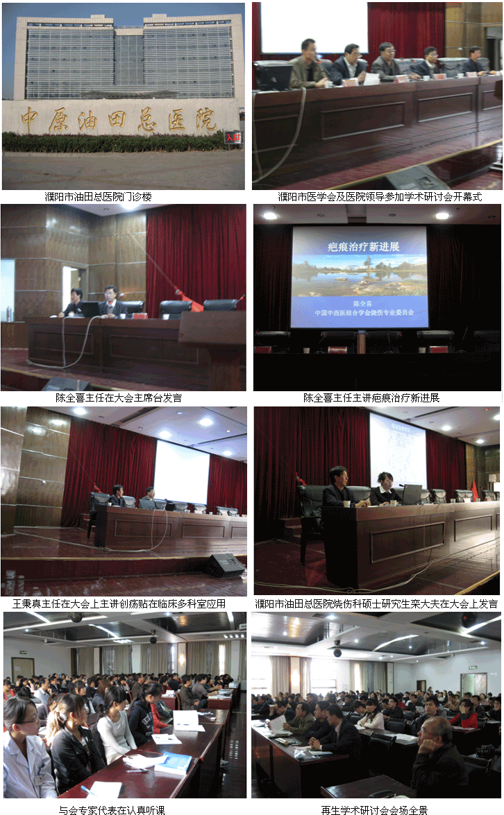 2010年10月16日,我國(guó)著名生命科學(xué)家徐榮祥教授創(chuàng)立的再生醫(yī)療新技術(shù)學(xué)術(shù)研討會(huì)在河南省濮陽(yáng)市油田總醫(yī)院勝利召開(kāi),上午8點(diǎn)30分,濮陽(yáng)市油田總醫(yī)院醫(yī)療處處長(zhǎng)耿長(zhǎng)雨、濮陽(yáng)市油田總醫(yī)院院長(zhǎng)楊立、市醫(yī)學(xué)會(huì)秘書(shū)長(zhǎng)王長(zhǎng)太,中國(guó)創(chuàng)瘍科技研究所陳全喜教授、河南省中西醫(yī)結(jié)合學(xué)會(huì)燒傷專業(yè)委員會(huì)副主任委員王秉真教授、河南鄭大一附院崔正軍教授、中華醫(yī)學(xué)會(huì)河南燒傷專業(yè)委員會(huì)常委、濮陽(yáng)市油田燒傷科主任醫(yī)師張巨祥等來(lái)自河南的濮陽(yáng)、安陽(yáng)、焦作、等地區(qū)和中原油田十一所醫(yī)院的專家、教授及專業(yè)人員共176人參加了學(xué)術(shù)會(huì)開(kāi)幕式,會(huì)議由張巨祥醫(yī)師。