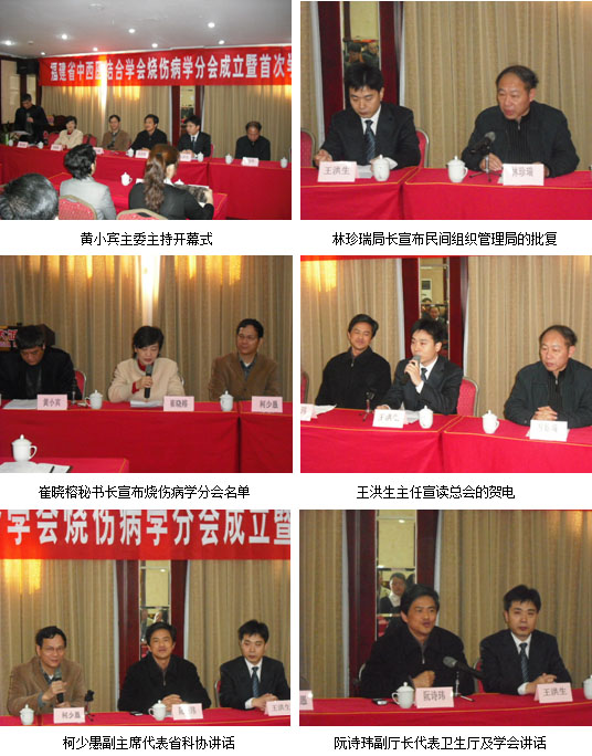 3月14日上午9時,金廣達(dá)大飯店16樓會議室座無虛席,來自福建省中醫(yī)學(xué)院、福建省人民醫(yī)院、福建省醫(yī)科大學(xué)第二附屬醫(yī)院、泉州醫(yī)學(xué)高等??茖W(xué)校、福建醫(yī)科大學(xué)附屬廈門第一醫(yī)院、泉州市人民醫(yī)院、龍巖市第一醫(yī)院、邵武市立醫(yī)院、永安市立醫(yī)院等省、市32家醫(yī)療單位的45余名從事燒傷、創(chuàng)傷、潰瘍等專業(yè)的專家、學(xué)者和業(yè)務(wù)骨干歡聚一堂,參加福建省中西醫(yī)結(jié)合學(xué)會第一屆燒傷病學(xué)分會成立大會暨學(xué)術(shù)研討會,上午9時,舉行了福建省中西醫(yī)結(jié)合學(xué)會第一屆燒傷病學(xué)分會成立大會暨學(xué)術(shù)研討會開幕式,開幕式由福建省中西醫(yī)結(jié)合學(xué)會燒傷病學(xué)分會主任委員、福建省人民醫(yī)院中西醫(yī)結(jié)合外科主任黃小賓主持,福建省衛(wèi)生廳副廳長、福建省中西醫(yī)結(jié)合學(xué)會會長阮詩瑋、福建省科協(xié)副主席柯少愚、福建省民政廳民間組織管理局局長林珍瑞、福建省中西醫(yī)結(jié)合學(xué)會秘書長、福建省衛(wèi)生廳醫(yī)政處副處長崔曉榕、中國中西醫(yī)結(jié)合學(xué)會燒傷專委會常委、中國中西醫(yī)結(jié)合學(xué)會燒傷專委會辦公室主任、北京美寶燒傷創(chuàng)瘍研究所副所長王洪生研究員應(yīng)邀出席了開幕式并在主席臺就座,在開幕式上,黃小賓首先宣讀了中國中西醫(yī)結(jié)合學(xué)會燒傷專業(yè)委員會及北京、廣東、廣西、云南、四川、重慶、陜西、湖南、河南、河北等省、直轄市、自治區(qū)中西醫(yī)結(jié)合學(xué)會、中西醫(yī)結(jié)合學(xué)會燒傷專委會發(fā)來的賀電,而后,福建省民政廳民間組織管理局林珍瑞局長宣布了“關(guān)于同意成立福建省中西醫(yī)結(jié)合學(xué)會第一屆燒傷病學(xué)分會”的批復(fù),福建省中西醫(yī)結(jié)合學(xué)會崔曉榕秘書長代表福建省宣讀了福建省中西醫(yī)結(jié)合學(xué)會“關(guān)于同意由黃小賓等35人組成福建省中西醫(yī)結(jié)合學(xué)會燒傷病學(xué)分會第一屆委員會的批復(fù)”,中國中西醫(yī)結(jié)合學(xué)會燒傷專委會王洪生主任宣讀了中國中西醫(yī)結(jié)合學(xué)會燒傷專委會的賀詞,福建省科協(xié)副主席柯少愚代表福建省科協(xié)對福建省中西醫(yī)結(jié)合學(xué)會第一屆燒傷病學(xué)分會的成立表示祝賀,接下來,福建省衛(wèi)生廳阮詩瑋副廳長代表福建省衛(wèi)生廳、福建省中西醫(yī)結(jié)合學(xué)會發(fā)表了熱情洋溢的講話,在講話中阮副廳長高度贊揚了我國著名生命科學(xué)家、醫(yī)學(xué)家、燒傷再生醫(yī)學(xué)的發(fā)明人徐榮祥教授近年來所取得的重大實驗及臨床研究成果,向福建省中西醫(yī)結(jié)合學(xué)會第一屆燒傷病學(xué)分會的成立及各位當(dāng)選委員表示熱烈的祝賀,對與會的各位領(lǐng)導(dǎo)、嘉賓、專家表示親切的問候。開幕式結(jié)束后,參加開幕式的領(lǐng)導(dǎo)、嘉賓與福建省中西醫(yī)結(jié)合學(xué)會第一屆燒傷病學(xué)分會委員及與會代表合影留念。