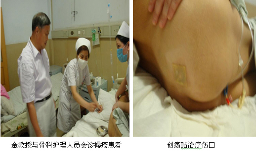 三峽大學(xué)仁和醫(yī)院內(nèi)一科是神經(jīng)內(nèi)科,呼吸內(nèi)科和理化中毒的大科,該院郝巧蓉護(hù)士長(zhǎng)和陳慧敏醫(yī)生熱情地接待了金教授。近期,該科接診了一位淋巴結(jié)核創(chuàng)面的老年患者,該患之前在外科住院兩個(gè)月,考慮到患者的年齡較大,醫(yī)生未對(duì)該患施行手術(shù)。目前該患的創(chuàng)面,未有大量分泌物滲出,竇道已封閉。該院在為該患治療時(shí),曾用過(guò)安福消炎膏,龍血竭粉外敷于創(chuàng)面,效果不理想,后改用美寶創(chuàng)瘍貼和濕潤(rùn)燒傷膏換藥已有一個(gè)多月。金教授仔細(xì)查看了該患創(chuàng)面,創(chuàng)面有供血,但無(wú)滲液,金教授建議患者的主治醫(yī)生繼續(xù)使用美寶創(chuàng)瘍貼和濕潤(rùn)燒傷膏聯(lián)合換藥,并講解了換藥時(shí)的注意事項(xiàng)。