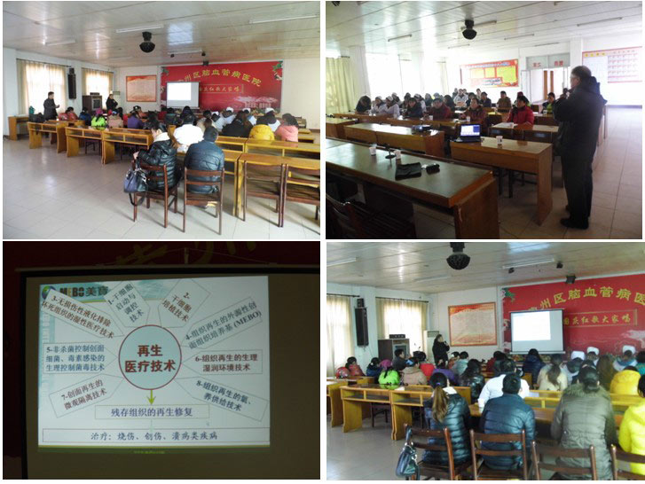 金黨軍教授針對(duì)醫(yī)院的情況,重點(diǎn)圍繞慢性皮膚潰瘍的治療技術(shù),從濕性燒傷治療技術(shù)開(kāi)始講解燒燙傷創(chuàng)面的換藥原則和方法,并提醒大家,燒燙傷創(chuàng)面換藥的方法貫穿所有慢性皮膚潰瘍,如壓瘡、糖尿病足、脈管炎引起的皮膚潰瘍等等常見(jiàn)創(chuàng)面;金黨軍教授還講述了清理創(chuàng)面遵循的三個(gè)原則,并結(jié)合實(shí)例臨床圖片,詳細(xì)講解了美寶再生醫(yī)療技術(shù)的理論和實(shí)踐。整個(gè)培訓(xùn)班進(jìn)行了兩個(gè)小時(shí),醫(yī)生們都表示收獲很多,對(duì)美寶再生醫(yī)療技術(shù)有了初步認(rèn)識(shí)。住院部一樓的付護(hù)士長(zhǎng)還專(zhuān)門(mén)請(qǐng)金老師到科室會(huì)診一位褥瘡患者,金老師會(huì)診后提出了治療方案,并結(jié)合剛剛課堂上講的方法,給病房護(hù)理人員講解再生技術(shù)臨床實(shí)踐的注意事項(xiàng)等。