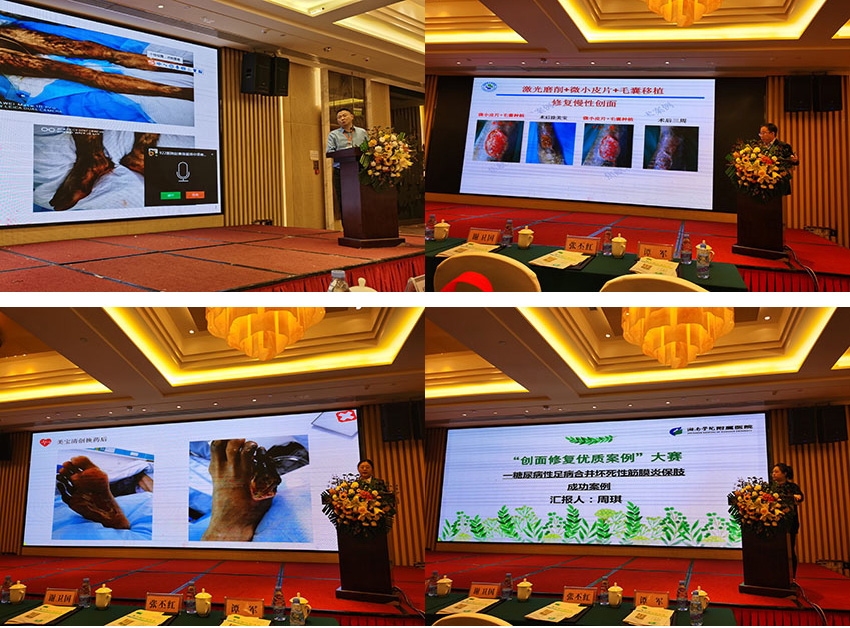 第二屆“榮祥杯”病例大賽一等獎獲得人員分別作了參賽病例的匯報,為各基層醫(yī)護人員規(guī)范使用再生醫(yī)療技術(shù)的努力和發(fā)展提供了方向和標(biāo)桿。婁底市第一人民醫(yī)院周勇以《再生醫(yī)療技術(shù)在特重度燙傷100%TBSA 患者中的應(yīng)用》為主題;瀏陽市人民醫(yī)院焦獻功以《美寶濕潤燒傷膏治療特大面積燒傷創(chuàng)面》為核心;湖南省人民醫(yī)院姚夢枝以《為糖尿病患者保駕護航--多學(xué)科診療合作(MDT)》為方向;湘南學(xué)院附屬醫(yī)院周琪以《一糖尿病性足病合并壞死性筋膜炎保肢成功案例》、中南大學(xué)湘雅三醫(yī)院胡蛟以《一例壓力性損傷合并截癱患者的創(chuàng)面修復(fù)案例 》做了現(xiàn)場病例展示。