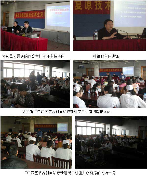 2012年10月21日至24日中國中西醫(yī)結(jié)合學(xué)會燒傷專業(yè)委員會委員、北京美寶燒傷創(chuàng)瘍研究所臨床部主任杜福勤和學(xué)會駐安徽辦事處張勇同志應(yīng)懷遠(yuǎn)縣人民醫(yī)院辦公室杜主任的邀請,23日下午15:00為懷遠(yuǎn)縣人民醫(yī)院外科、內(nèi)科、婦產(chǎn)科、骨科、內(nèi)二科、五官科等科室及中醫(yī)院舉辦了“中西醫(yī)結(jié)合創(chuàng)面治療新進(jìn)展”講座,講座由醫(yī)院辦公室杜主任主持,60余名醫(yī)護(hù)人員參加了講座學(xué)習(xí),杜福勤主任結(jié)合臨床實(shí)踐圖文并茂的介紹了再生醫(yī)療技術(shù)的創(chuàng)立、理論基礎(chǔ)研究、臨床實(shí)踐以及國內(nèi)外的臨床實(shí)踐研究和臨床發(fā)展。介紹了2012年5月江蘇南通國際學(xué)術(shù)會議成功召開的情況。下午五點(diǎn),進(jìn)行了二個多小時的講座在多次熱烈掌聲中結(jié)束。會議介紹后,杜福勤主任應(yīng)衛(wèi)生局一位領(lǐng)導(dǎo)邀請為一名膽囊手術(shù)刀口不愈合患者會診,介紹應(yīng)用MEBO創(chuàng)瘍貼換藥治療刀口難愈創(chuàng)面的方法和技巧,受到患者及家屬的歡迎。